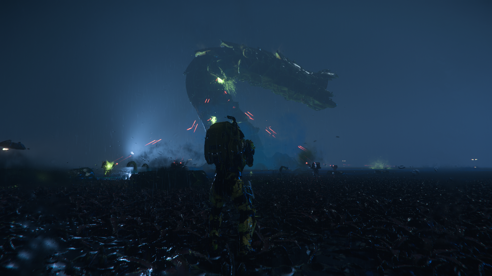 The battlefield itself is a testament to the ferocity of the struggle. Hulks of Polarises and shattered Idrises drift across broken flight lanes and crash-scarred plains, their twisted frames standing as both obstacles and monuments to the fury of the fight. Salvage crews hover at the edges of the facility, but the combat never relents long enough for them to strip even a fraction of the wreckage. The sky is never silent.